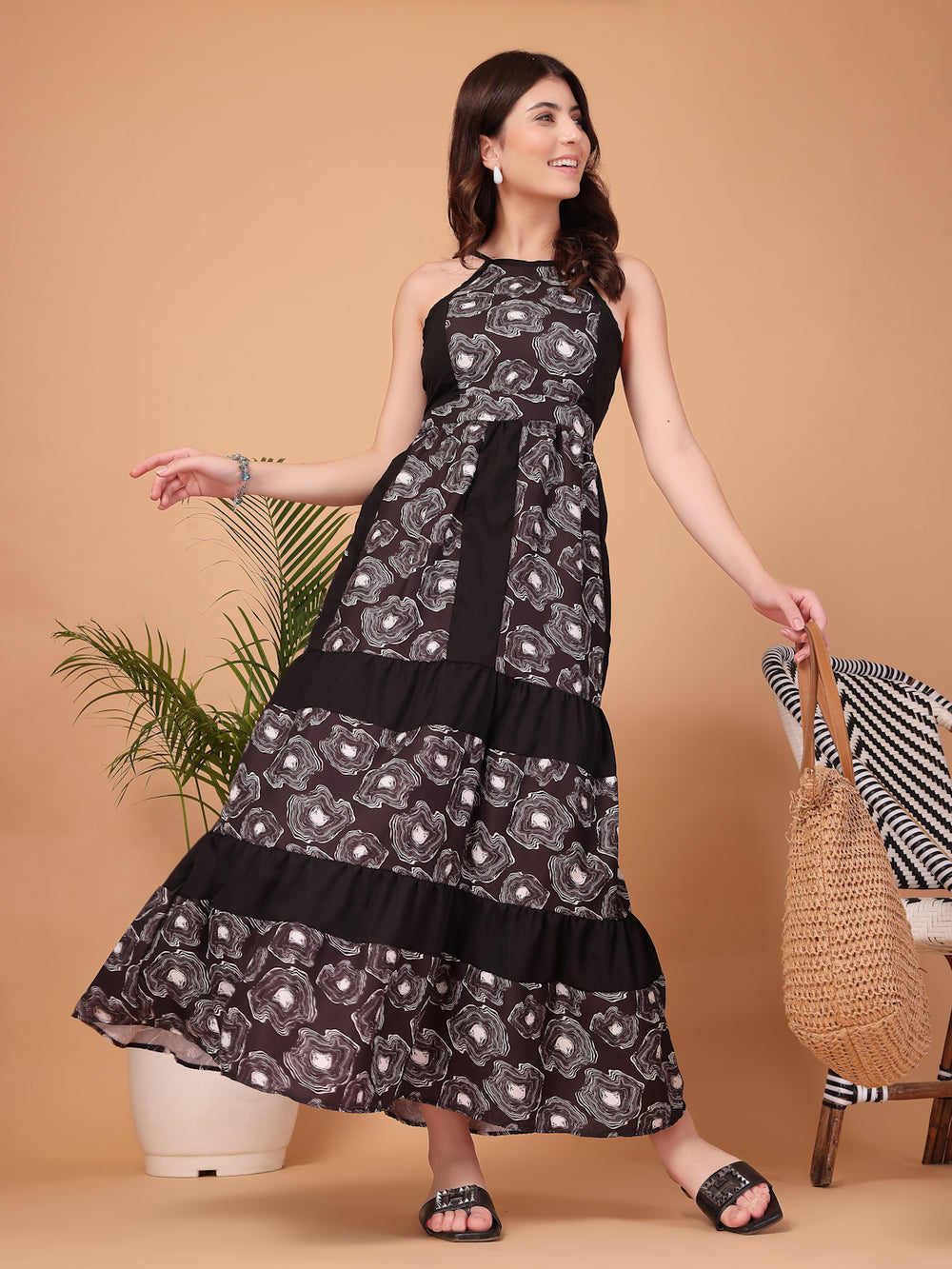 This strappy halter maxi serves that perfect balance of comfort and main character energy. The swirl print is giving abstract art, the tie-back is giving backless goddess, and the tiered silhouette? A dream for every body type!