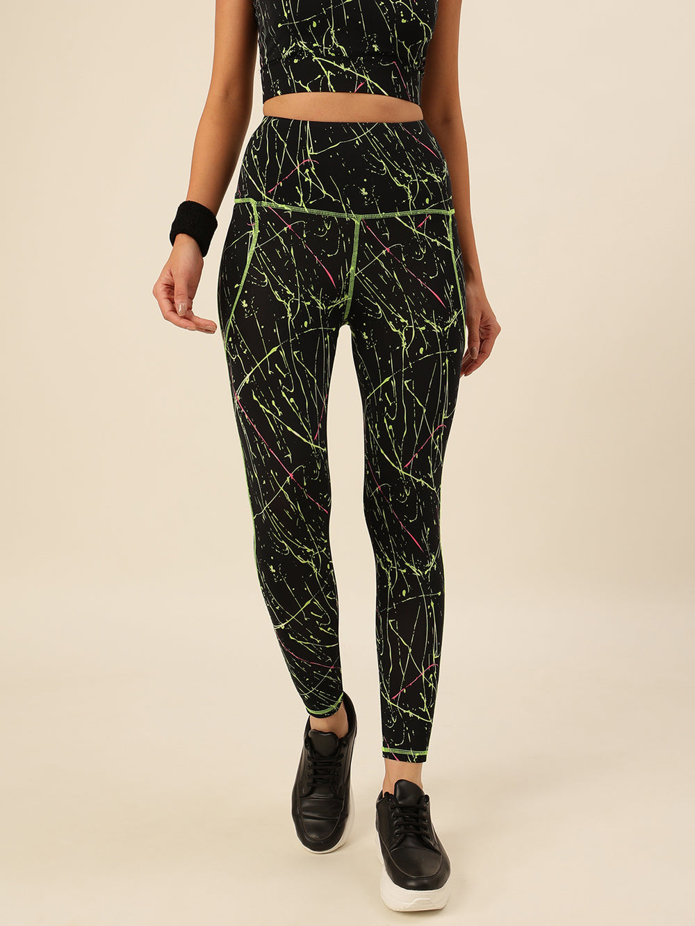 Why You'll Love It: Looking for workout wear that stays put better than mehendi on your hands? You've found it! Our 4-way stretch fabric remains loyal through every jump, squat, and stretch. Plus, the striking paint splatter print in black with neon green and pink accents is more energizing than your morning masala chai!