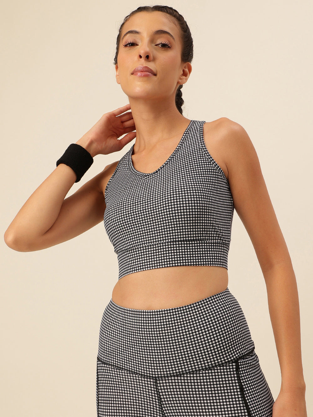 Why You'll Love It: Looking for workout wear that doesn't play hide and seek during surya namaskars? You've found it! Our 4-way stretch fabric stays put through every jump, squat, and stretch. Plus, the classic gingham print is giving "modern maharani" vibes!