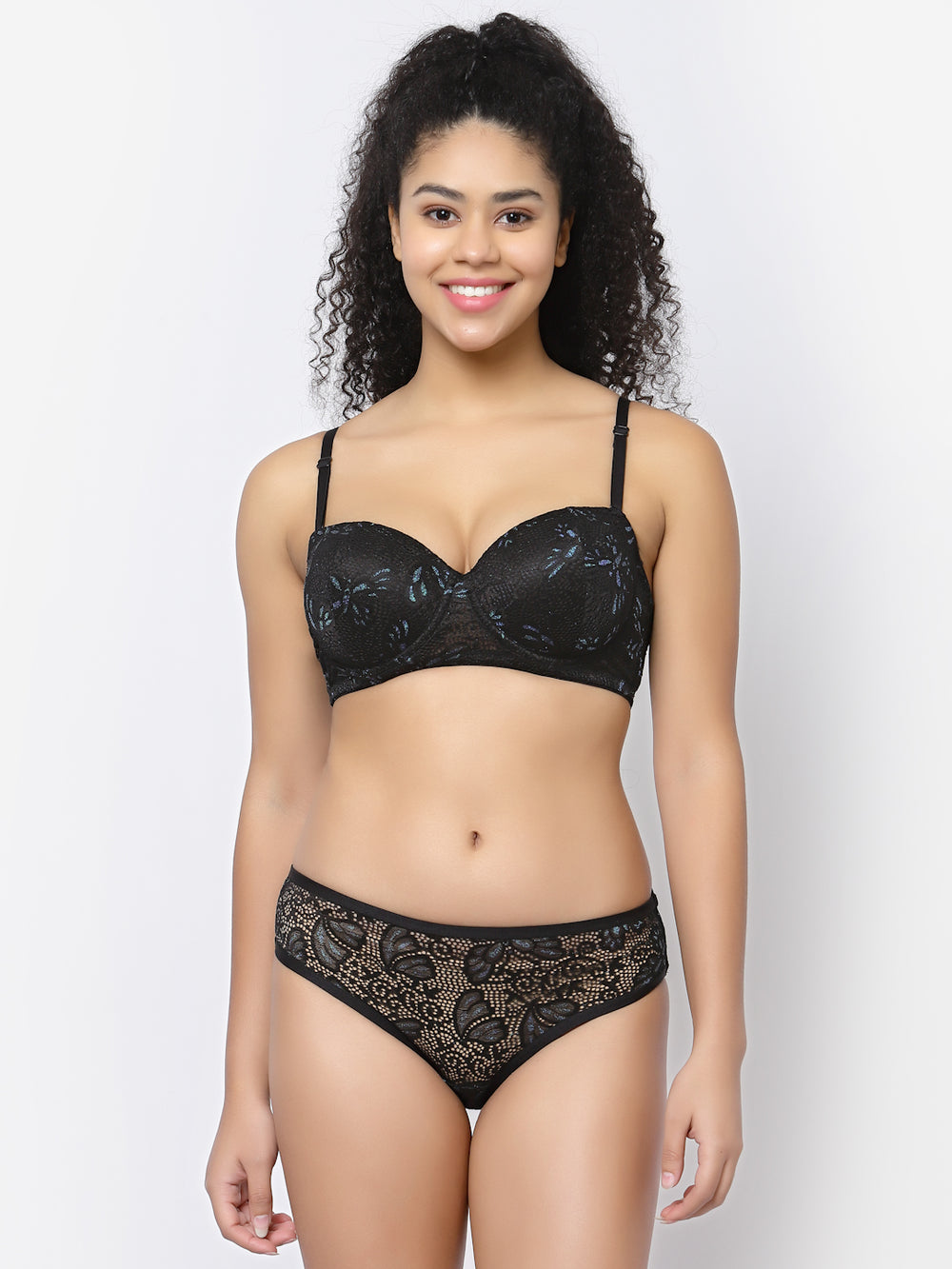 | CUKOO is a contemporary brand for swimwear, activewear and lingerie giving comfort as well as stylish and colorful looks. This is a Black lacy super soft panty & lacy Bra lingerie set |