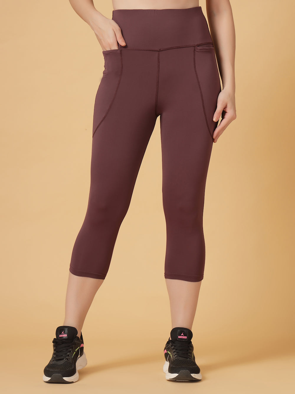 These plum high-waist capri leggings are your perfect blend of sleek and functional. With side pockets for your essentials, a sculpting waistband, and cropped length that’s just right for workouts (or chai runs), they keep you supported and stylish from warm-ups to wind-downs.