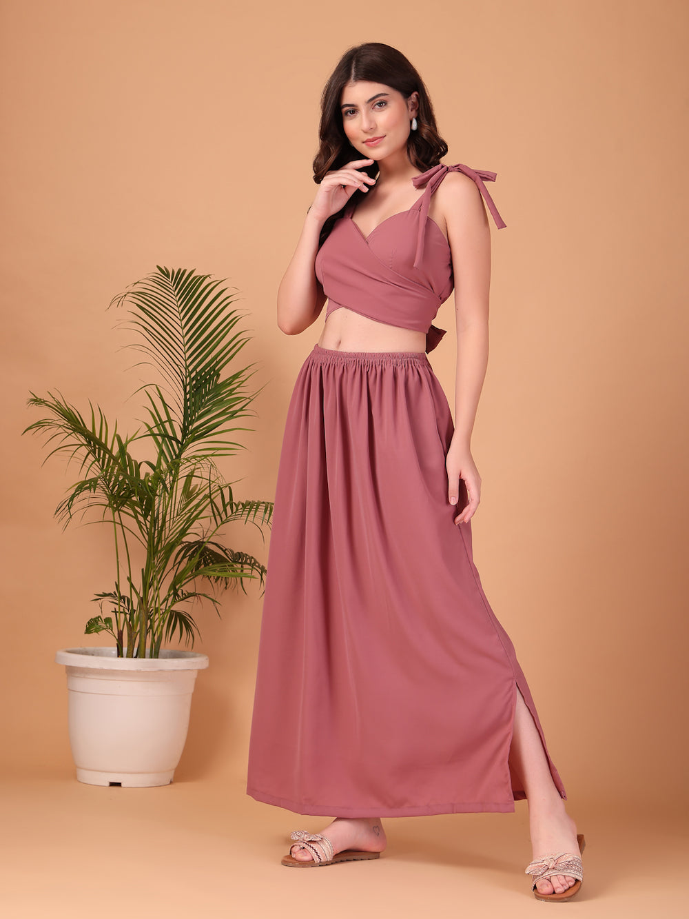 With a wrap-style top that snatches the waist and shoulder tie-ups giving total "Pinterest board" energy, this set is made for drama (the good kind). The full-length skirt flows like a dream, hiding food babies and flaunting just enough flair.
