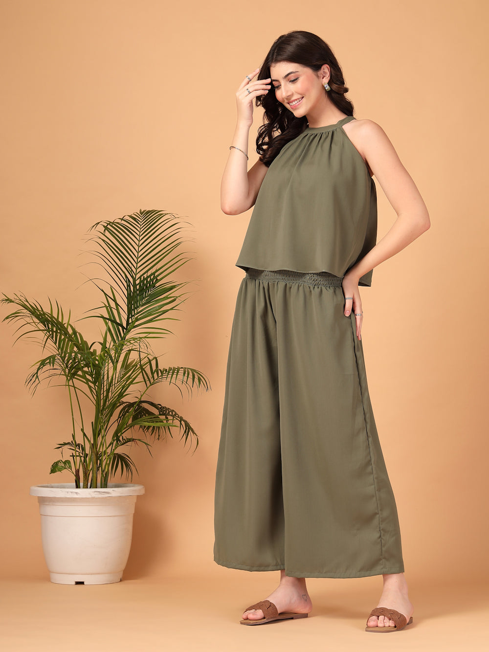 This olive green georgette co-ord is here to rescue your “what to wear on vacay” crisis with its breezy fit and understated glam.